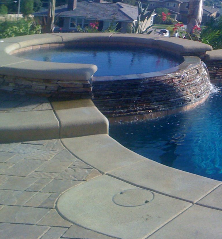 Spillways are types of waterfalls. They are created by allowing water to spill over the dam that protects a raised spa from the swimming pool or just from the sides of the swimming pool. They can be single, multiple or tiered for a more natural look. They can come from under lips in the coping so that they are invisible when not running or even out of pots or other decorative structures like columns.